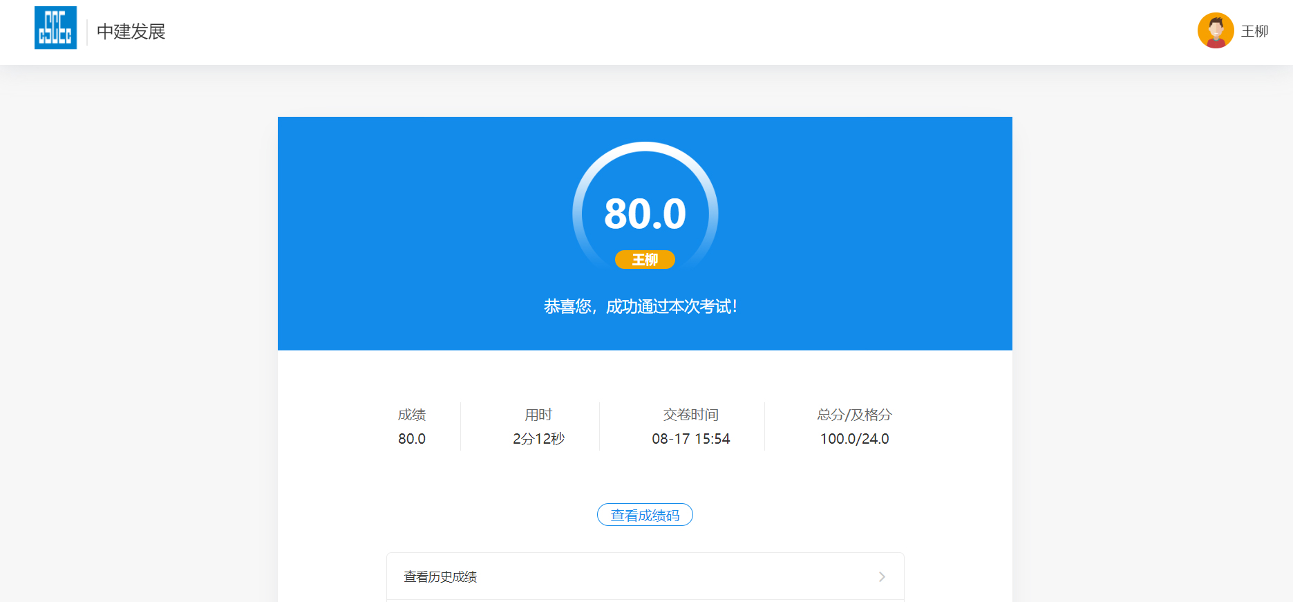 本次知识竞赛试题都是选择题,中建发展HR在上传竞赛题目时,已经设置好了试题的答案;然后在设计试卷时,根据单选题、多选题不同题型试题来合理设置分数。参赛人员答完所有试题交卷后,考试云会自动阅卷打分,能直接出竞赛结果,不需要中建发展HR再安排人员进行阅卷,节省很多时间。