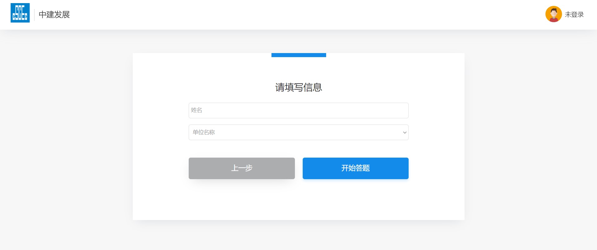 有多个单位参加本次知识竞赛,为了能清楚分辨参赛人员,中建发展HR在创建考试时,选择了免登录的参加方式,姓名是考试云系统中的必填项,不能进行更改。中建发展HR增加了一条“单位名称”字段信息,使用的选择框格式,添加本次参加的所有单位名称,并要求为必填项。参赛人员在填写信息时,填写好姓名后,可以直接点击下拉框选择所属单位。