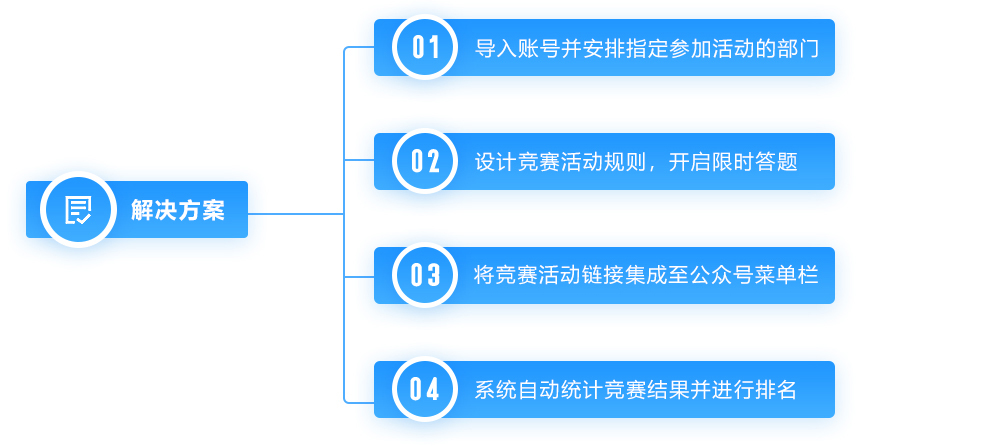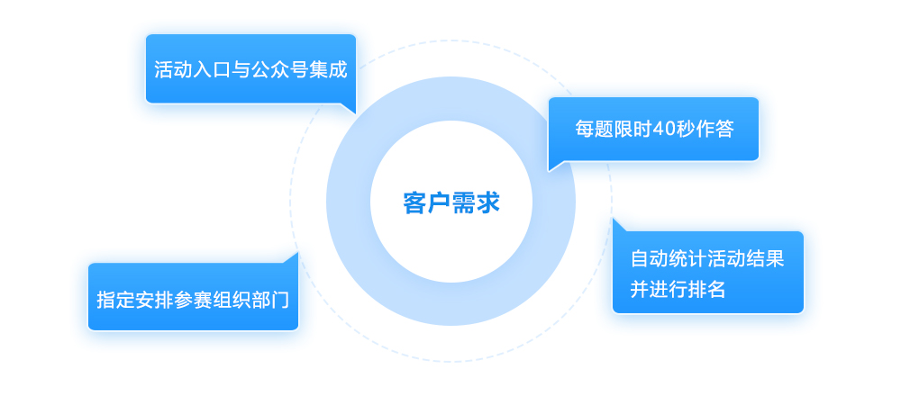 针对重庆市公安局工会提出的需求,考试云团队从功能技术、需求应用角度进行整体分析,为客户提供了“活动入口集成至公众号菜单栏——安排指定参加活动的部门组织——设计竞赛活动规则——统计竞赛结果进行排名”的活动方案。