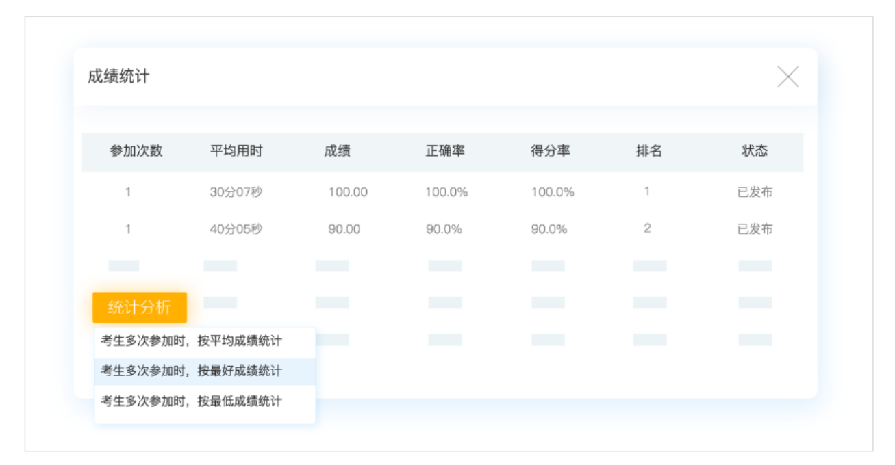 在竞赛活动结束后,考试云将会自动统计答题数据并进行排名,对于多次参加答题的考试,可以自主选择成绩统计的方式。本次竞赛活动,负责人选择“多次参加考试时,按平均成绩统计”的方式,对参赛人员进行排名。