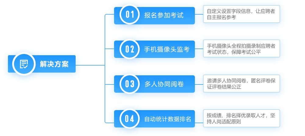 基于上述需求,考试云团队提供了“自主报名参考——手机摄像头全程监考——多人协同批阅试卷”的招聘笔试方案。