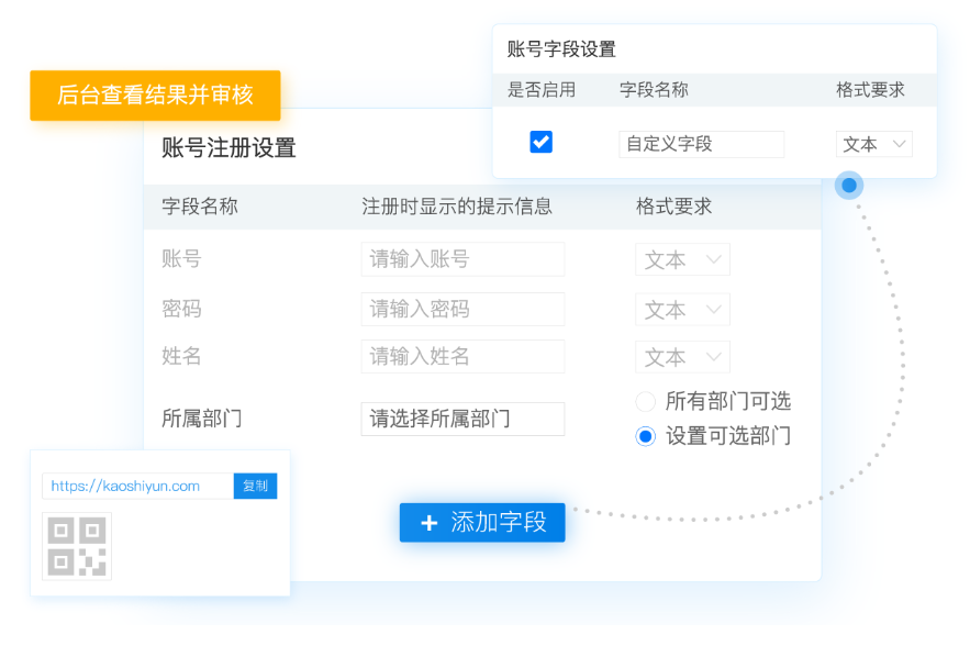 此次招聘笔试为公开性考试,海西公司的人事负责人使用考试云注册报名的功能,自定义应聘者需要填写的信息字段、设置好招聘岗位分类层级,应聘者报名后,人事负责人在后台审核报名即可。