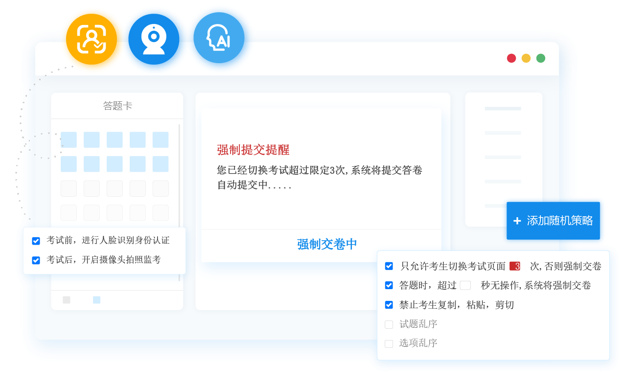 除了手机摄像头监考,考试云还有考前人脸验证核验应聘者身份,考试全程电脑摄像头、电脑屏幕录制监控,防切屏、禁止复制粘贴、无操作强制交卷等防作弊措施保证笔试的公平。