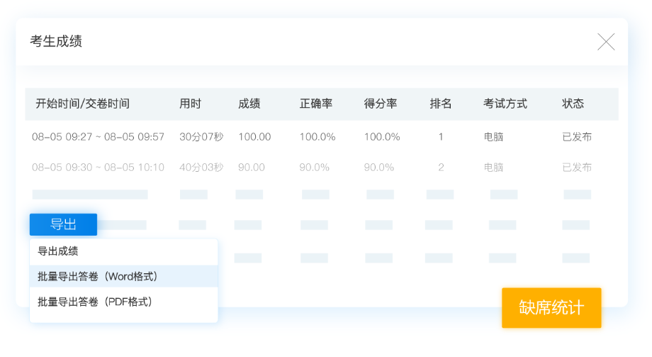 所有岗位负责人完成评卷后,考试云会自动统计应聘者的用时、分数、正确率、得分率并进行排名,人数负责人可清晰直观的查看考试报表并依据排名确认录取人选。