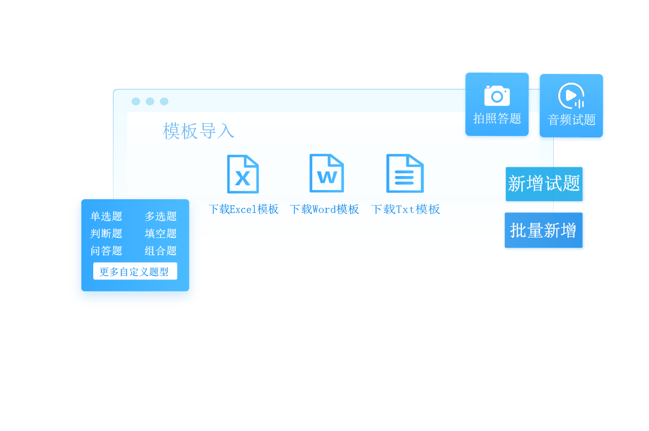 考试云有Excel、Word和Txt模板导入方式,还有单个新增试题、批量新增试题的方式,可以无限层级创建试题分类管理试题,能够快速创建专属的试题库。