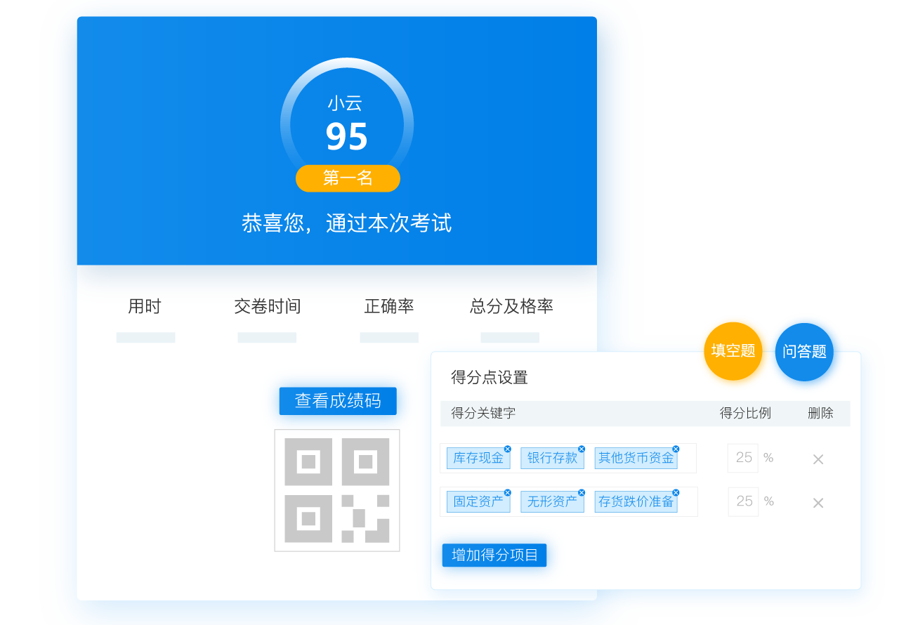 参赛者每一次答完试题提交试卷时,系统都将即可显示本次答题的分数,这是由于考试云能够在参赛者交卷后,自动比对标准答案进行阅卷判分。