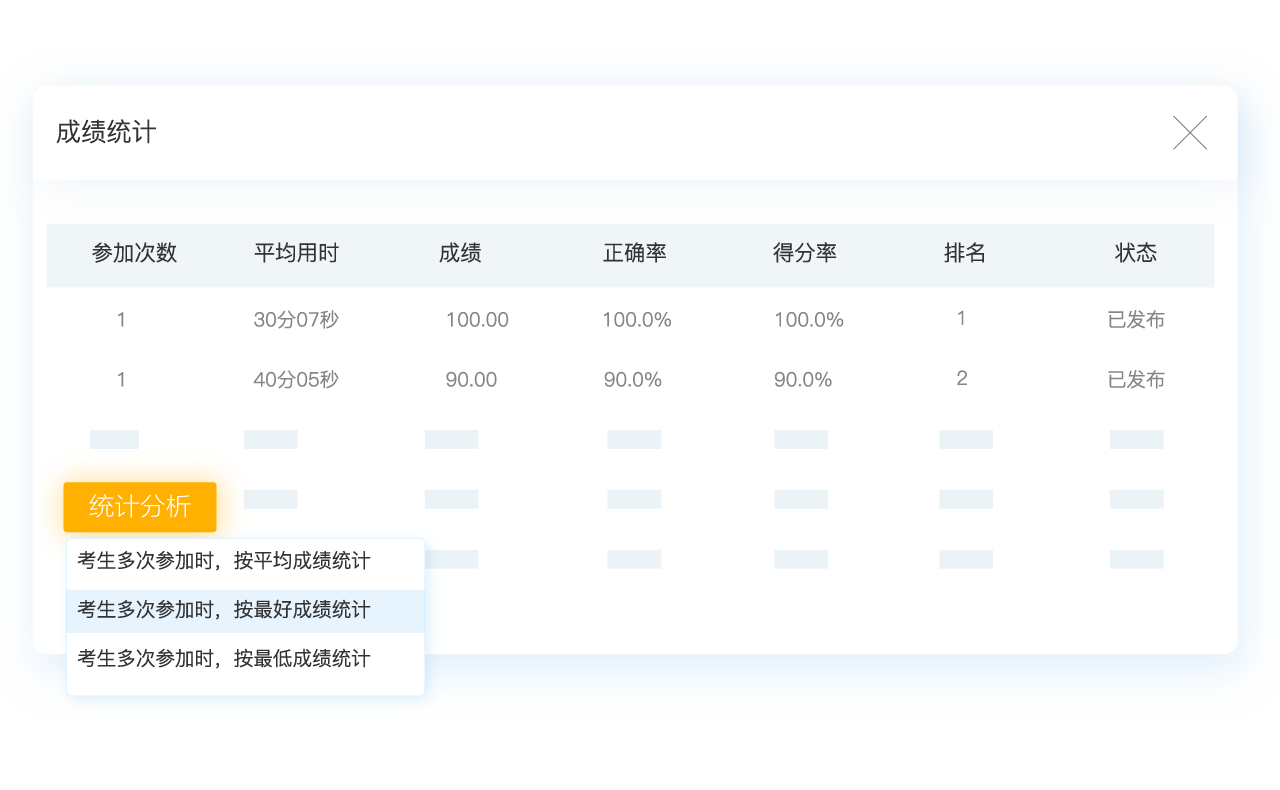 本次选拔赛,允许参赛者多次答题,所以最终选择通过考试云的成绩统计报表,按照“多次参加时,按最好成绩统计”的统计方式进行排名筛选人员。