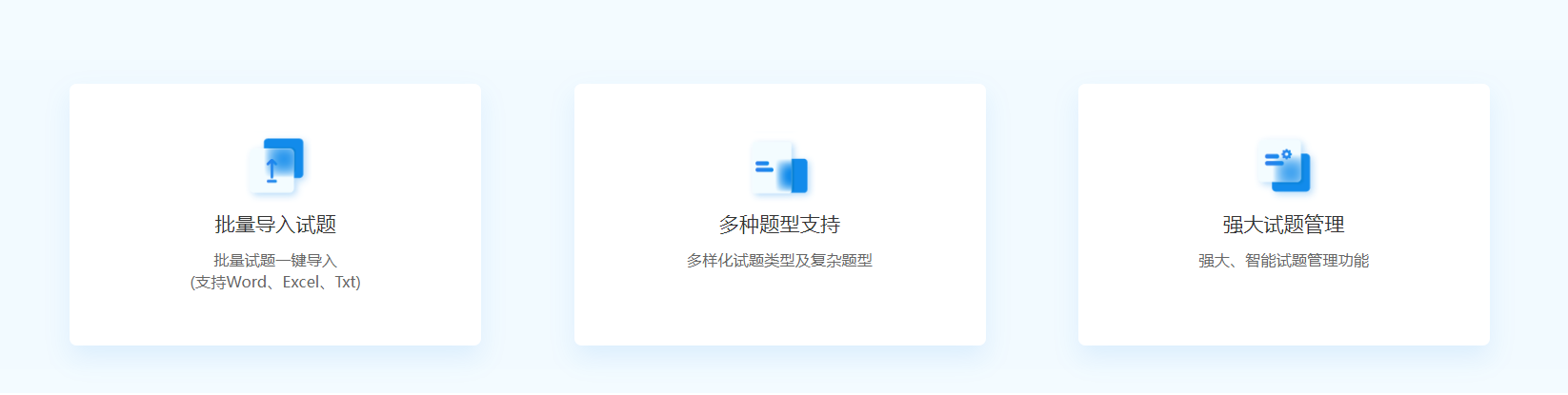 - 通过试题模板,高效、快速批量导入试题,支持Excel、Word、Txt标准模板组织试题