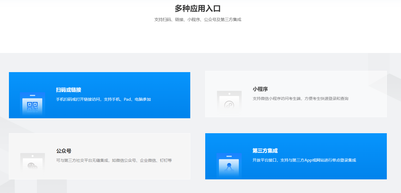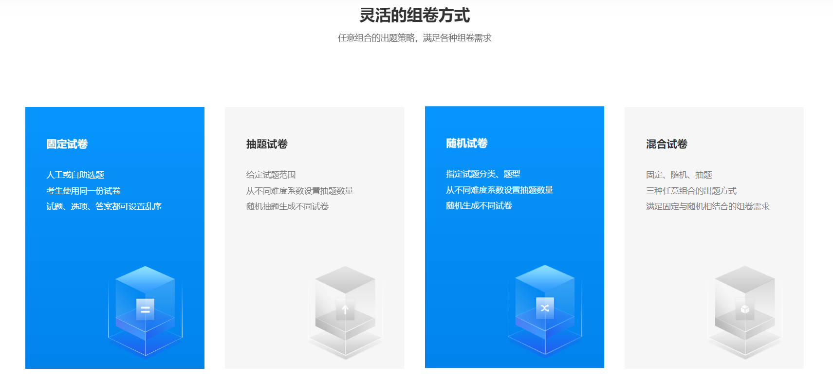 - 考试云灵活的出题组卷方式,支持固定试卷、抽题试卷、随机试卷、混合试卷。